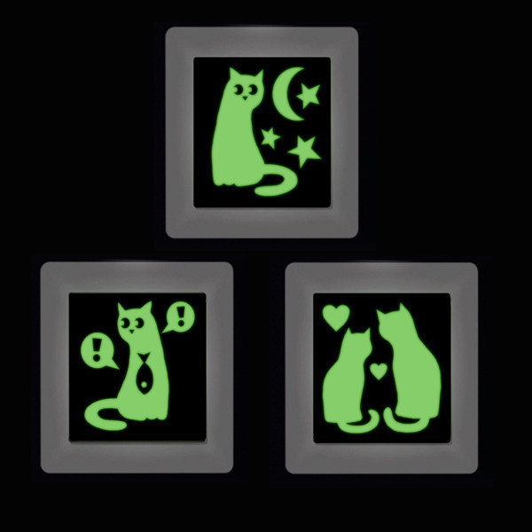 Наклейки - с милыми котиками, как иначе. Из люминесцентной пленки, которая светится в темноте нежным зеленым светом. Их очень легко приклеить на нужное место - мы проверили, справляются даже дети. И днем их практически не видно. Они "заряжаются" светом даже от самой тусклой лампы в течение дня, после чего их хватает на всю ночь.